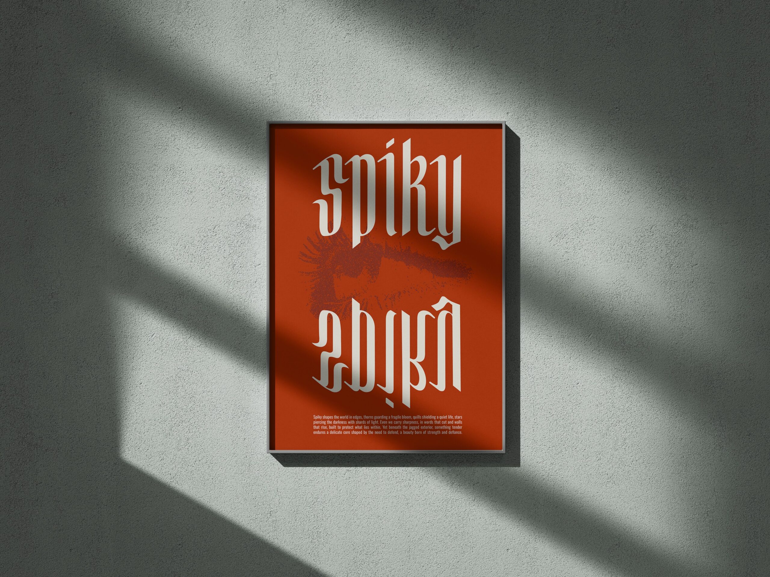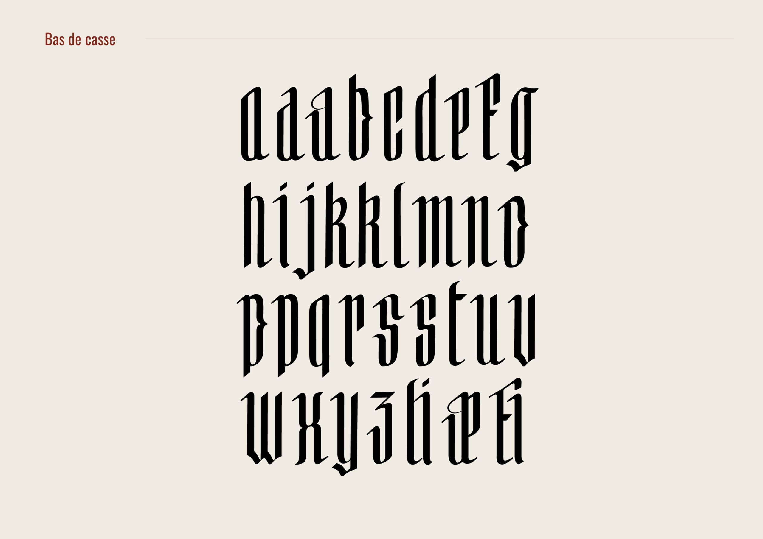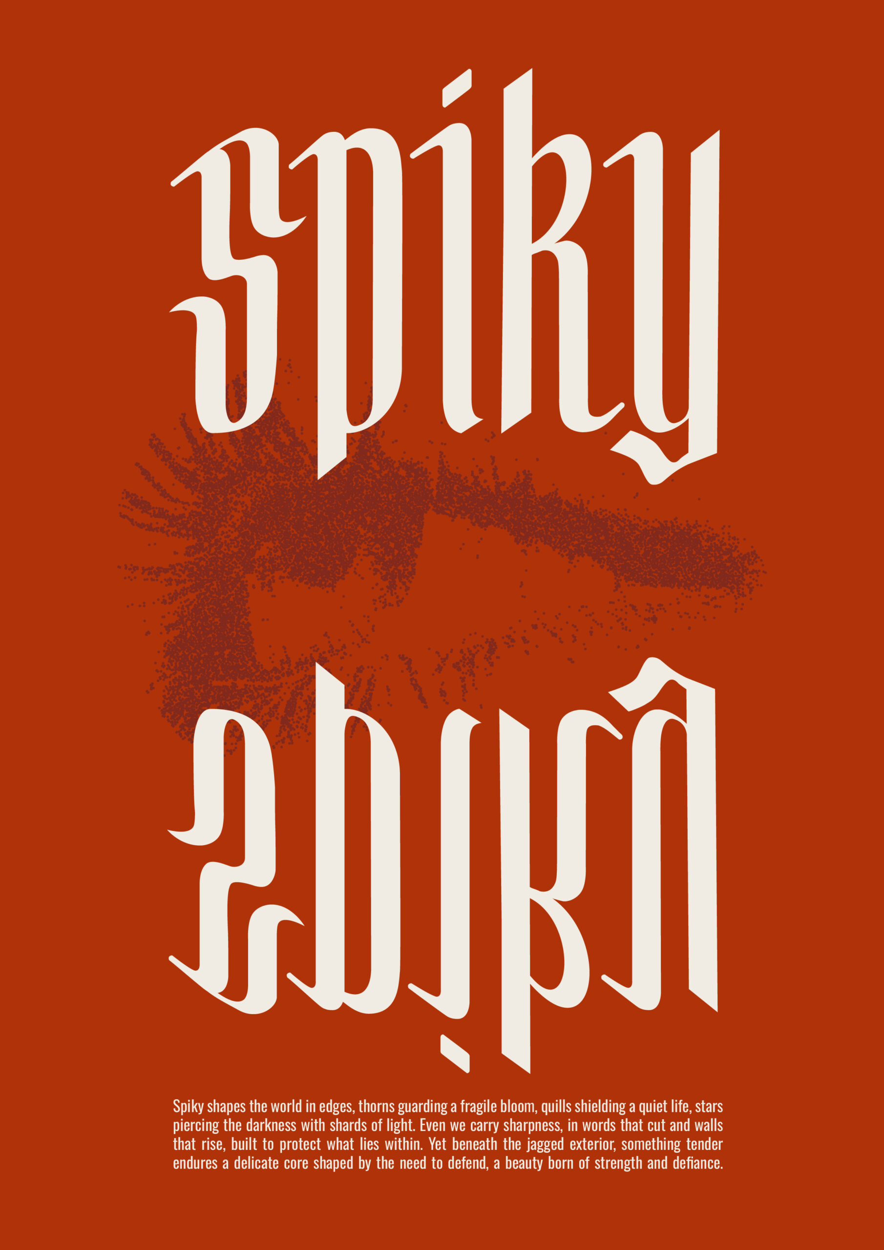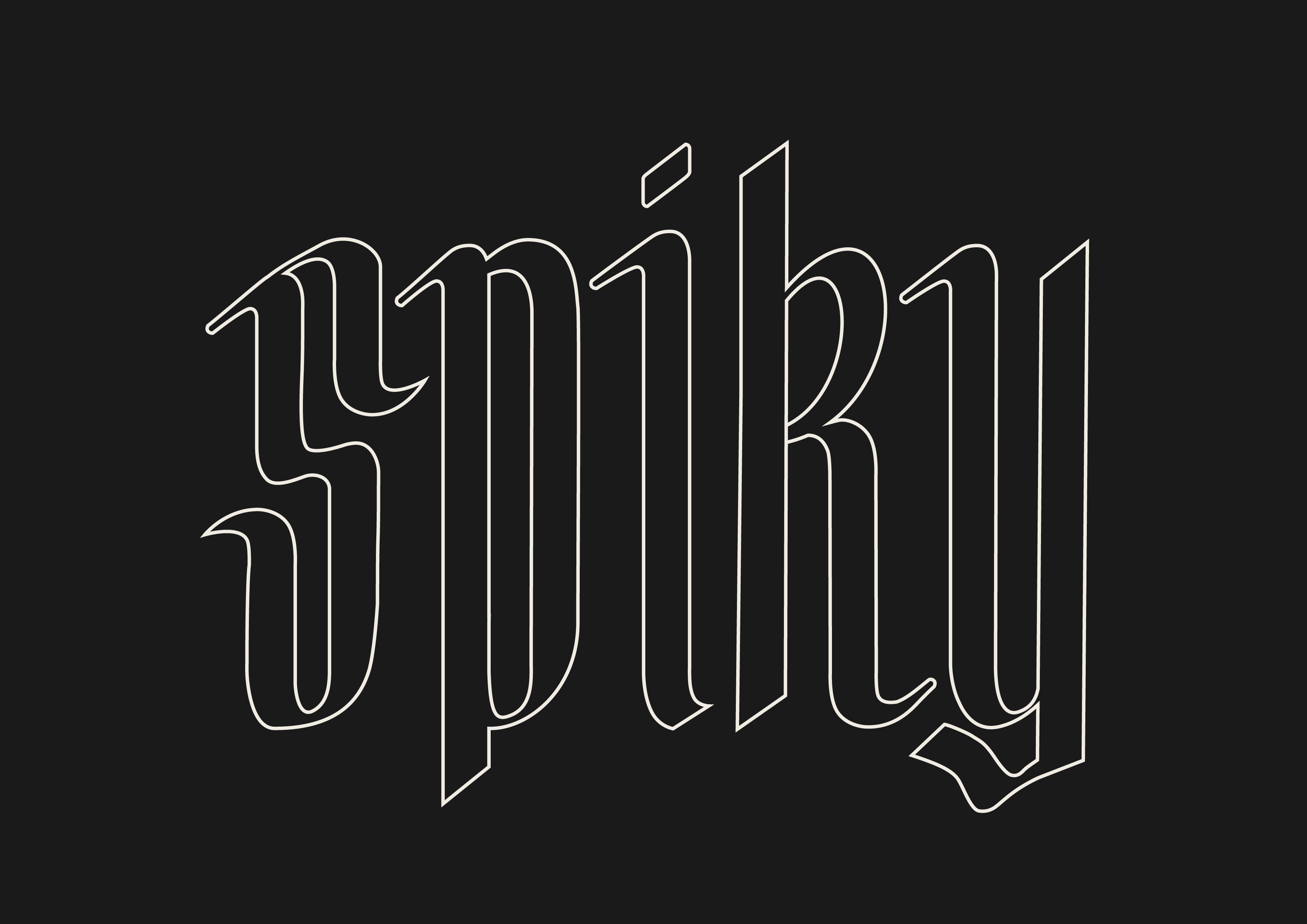 Spiky est une typographie gothique contemporaine qui réinterprète les codes typographique avec une approche plus moderne et expressive. Issue d’une exploration calligraphique à la plume, elle conserve la rigueur des tracés historiques tout en simplifiant leurs formes pour en révéler la force graphique. L’augmentation de la hauteur d’x et l’assouplissement des angles lui confèrent une lisibilité accrue et une présence visuelle affirmée. Le résultat est un caractère à la fois ancré dans la tradition et résolument tourné vers les usages graphiques actuels.